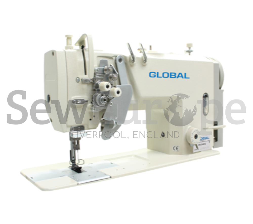 Double needle lockstitch machine with drop and needle feed. Fully automatic lubrication, standard hook and 6,4 mm gauge.